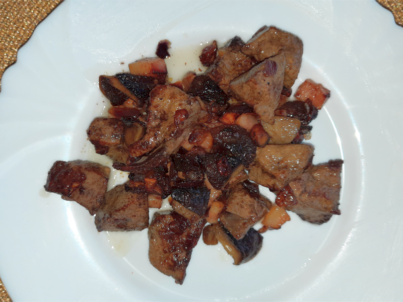 Během dušení hub je můžete podle chuti okořenit, já použil drcený kmín a klasický pepř. Nakonec jsem ještě na pánev (použil jsem vok) přihodil osmažená játra a podusil je s výše uvedeným základem. Doba dušení záleží na tom, jestli chcete mít játra světlejší nebo tmavší. Já je dusil pomalu asi čtvrt hodinky.