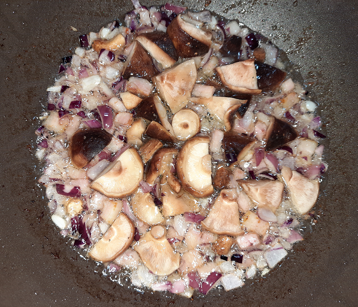 Pak jsem dal na pánev osmažit cibuli se slaninou a poté co byla cibule taková jako trochu skleněná, jsem přidal houby a trochu je podusil (houby pustí vždy dost vody):