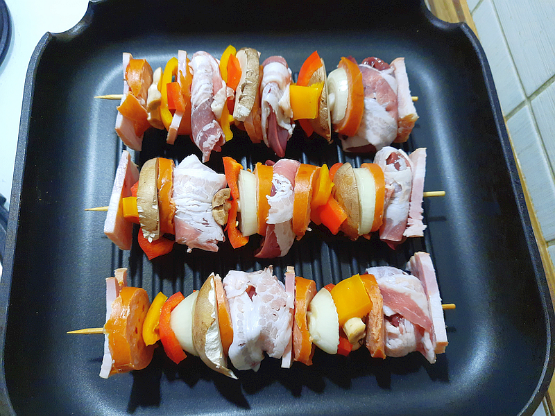 Játra jsem nakrájel na kousky a zabalil do tenkých plátků slaniny. Ostatní suroviny jsem nakrájel na plátky nebo kolečka a vše postupně napíchal na tři špejle, jak ukazuje první snímek.