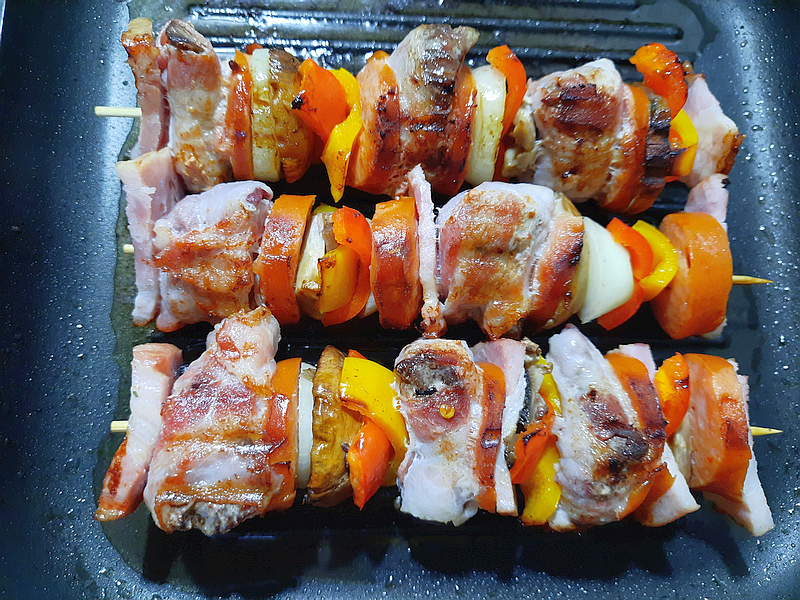 Grilovací vlnkovanou pánev jsem potřel olejem a špízy pomalu griloval (nebo smažil?). Postupně jsem je otáčel, aby se ogrilovaly ze všech stran pokud možno stejnoměrně.