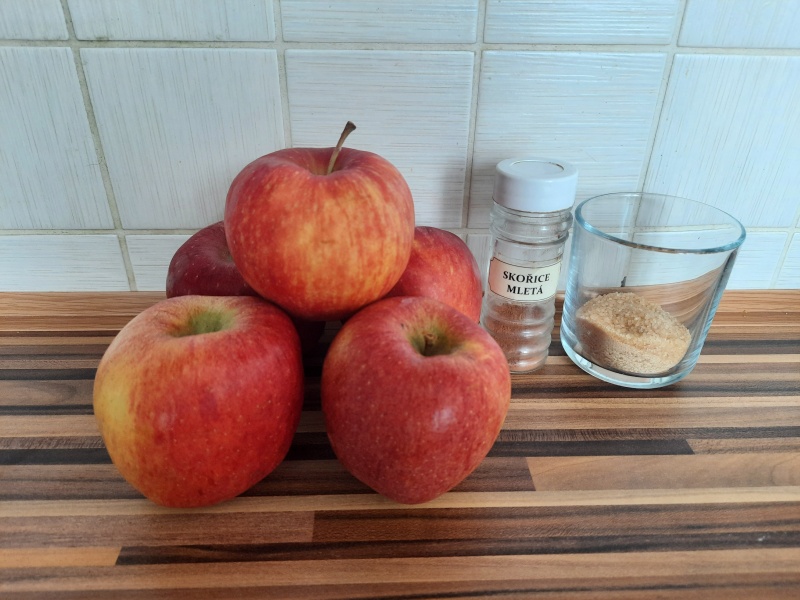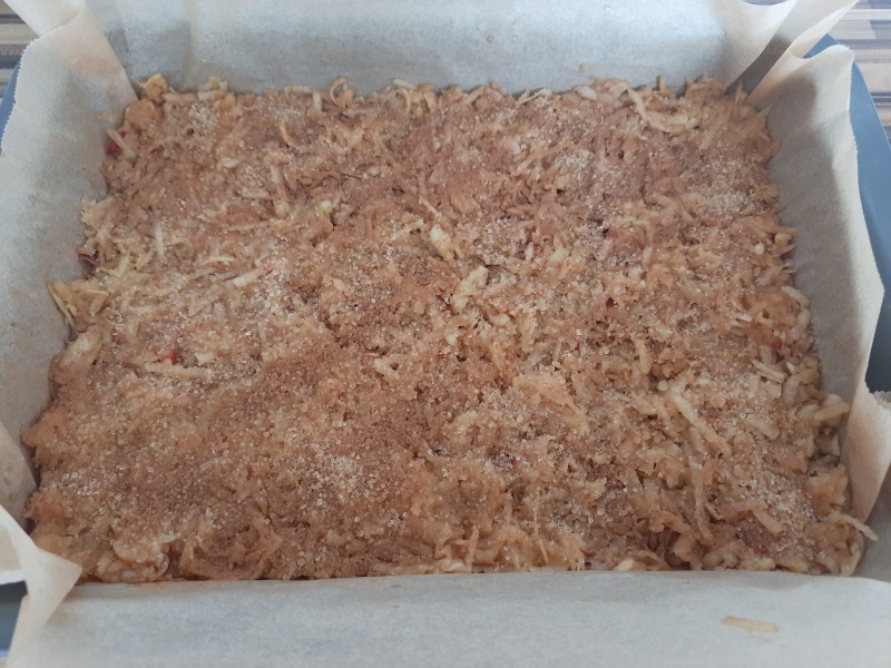 Z jablek jsem vymačkala šťávu a rozprostřela je na dno pekáčku vyloženého pečícím papírem. Vrstva byla vysoká asi jeden centimetr. Posypala jsem ji skořicí a třtinovým cukrem.