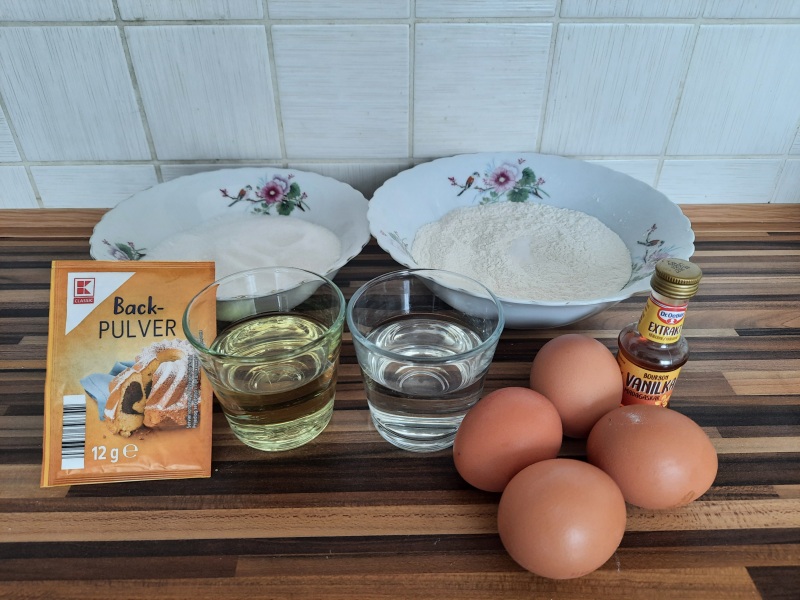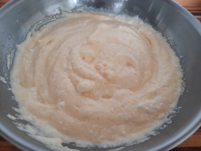 Pak jsem se pustila do přípravy těsta. Žloutky jsem oddělila od bílků, přidala k nim cukr a v robotu je vyšlehala. Poté jsem za stálého míchání přidala olej, teplou vodu a trochu vanilkového extraktu.