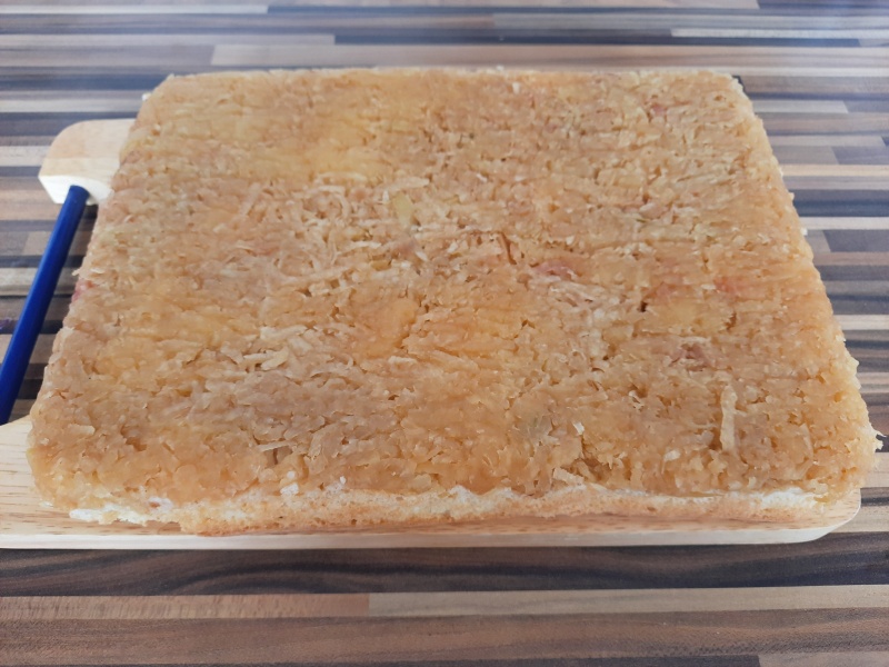 Na koláč jsem pak dala prkýnko, otočila ho a koláč jsem vyklopila z pekáčku. Opatrně jsem sundala pečící papír z jablečné vrstvy.
