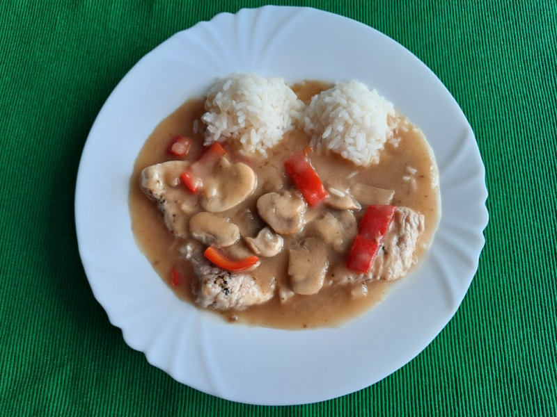 Podáváme s rýží nebo s bramborem. Myslím, že i houskový knedlík by se k této omáčce hodil.