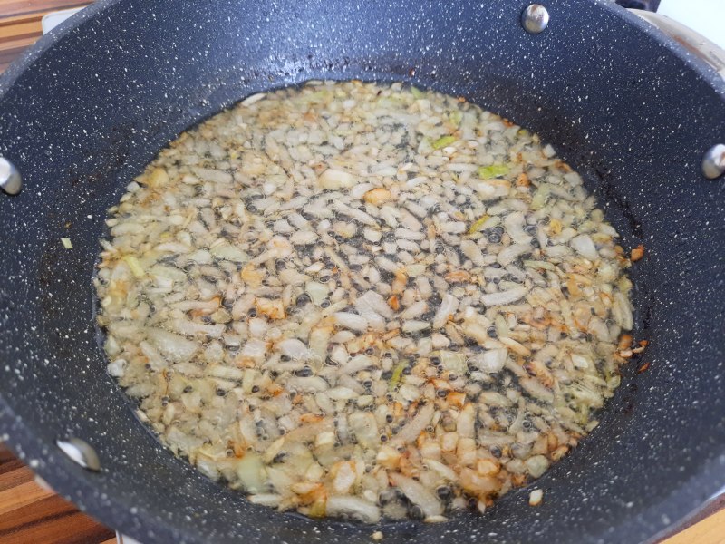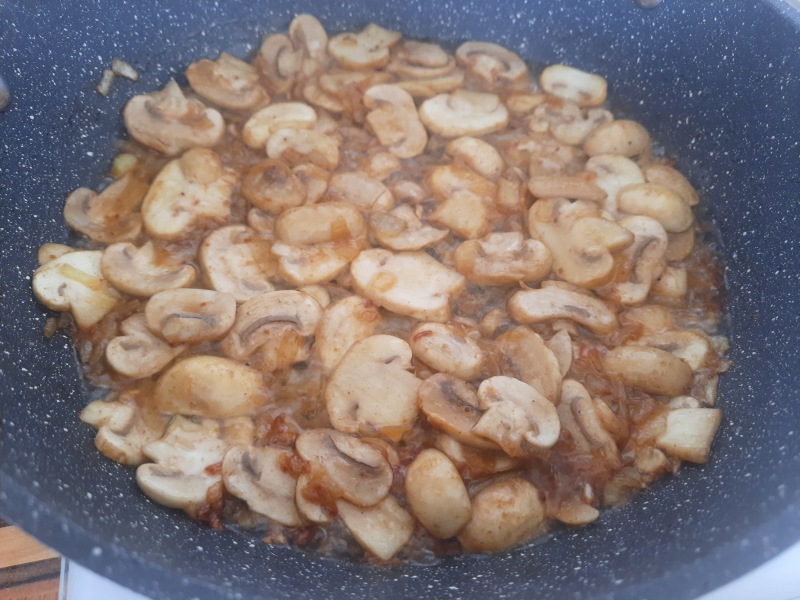 Pak přidáme nakrájené žampiony. Posypeme je mletým kmínem a restujeme asi 10 – 15 minut.