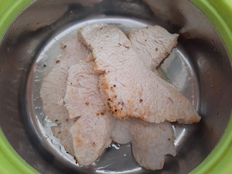 Poté přidáme plátky masa, bujón a zalijeme 1/2 litrem vařící vody. Přivedeme znovu k varu a dusíme ještě asi 10 minut. Pak přidáme kapie nakrájené na plátky. Omáčku zahustíme moukou rozkvedlanou ve studené vodě. Ještě chvíli povaříme a máme hotovo.