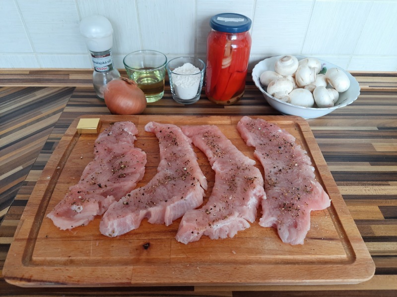 Nejprve si připravíme suroviny. Plátky masa trochu naklepeme, osolíme a opepříme. Cibuli nakrájíme na kostičky, žampiony na plátky asi 5-7 mm tlusté.