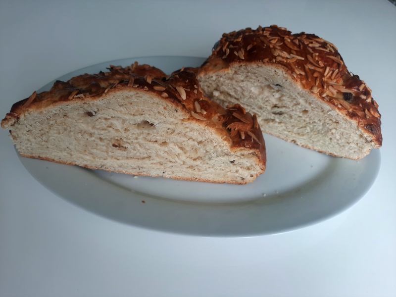 Bochánek postříkáme vodou a ještě ho necháme asi hodinu kynout. Poté ho potřeme rozkvedlaným vejcem, posypeme mandlemi a pečeme v předehřáté troubě na 160 °C asi 40 – 45 minut.
