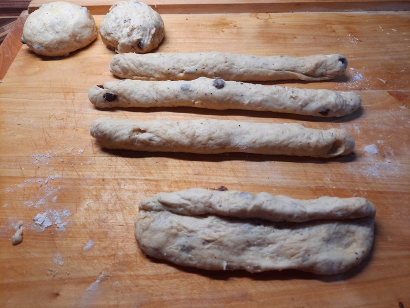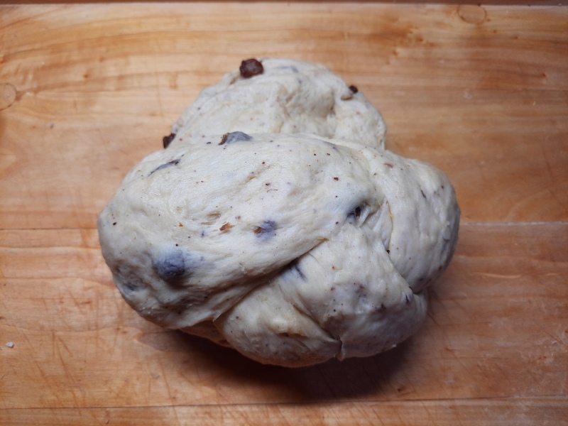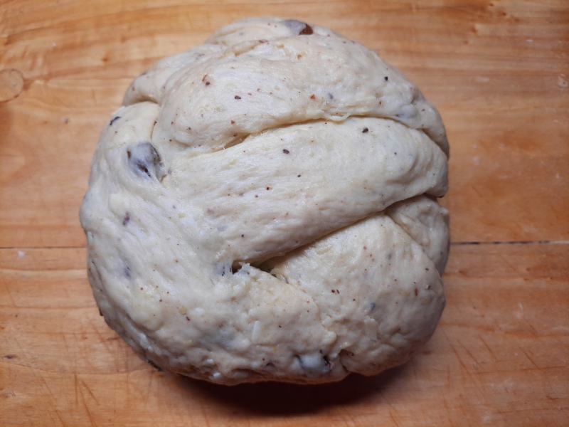 Do robotu jsem nasypala mouku, cukr, badyán, citrónovou kůru, rozdrobila droždí, rozklepla vejce, přidala jogurt a mléko. Hnětacím hákem jsem se pustila do zpracování surovin. Těsto se mi zdálo suché, ale vydržela jsem a nepřilila mléko. Spravilo to máslo, které jsem po minutě hnětení spolu se solí přidala do těsta. Asi po 6 minutách jsem těsto vyklopila na vál a ručně jsem do něj zapracovala rozinky a šupinky čokolády. Nejlepší je udělat z těsta placku, posypat ji uprostřed rozinkami a čokoládou a strany placky přes náplň překlopit.