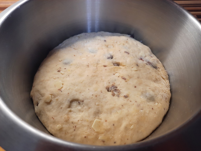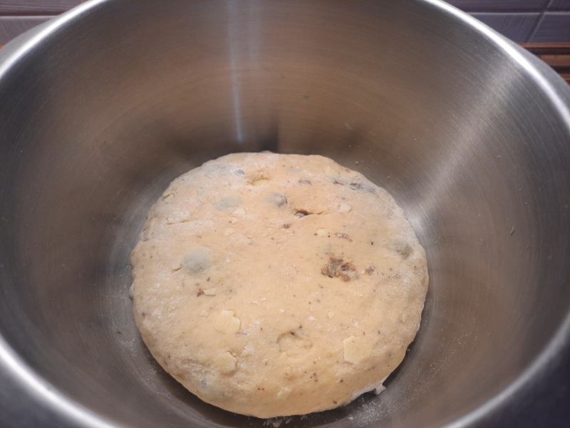 Z těsta vypracujeme bochánek, který vložíme do mísy, kterou přikryjeme potravinářskou fólií a těsto necháme na teplém místě asi 1 hodinu kynout. Těsto by mělo zdvojnásobit objem.