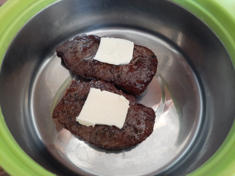 Osmažené steaky jsem vložila do termo nádoby, nahoru přidala plátek másla, přiklopila a nechala chvíli odpočívat.