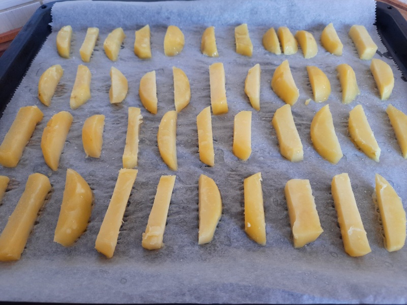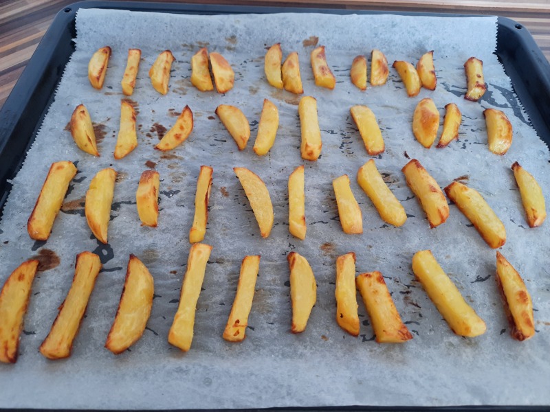 Zatím si můžeme předvařit brambory na hranolky. Vařila jsem je ve slupce asi 10 minut. Chvíli jsem je nechala chladnout a ještě teplé je oloupala a nakrájela na hranolky. Hranolky jsem na plechu vyloženém pečícím papírem postříkala olejem a posolila.