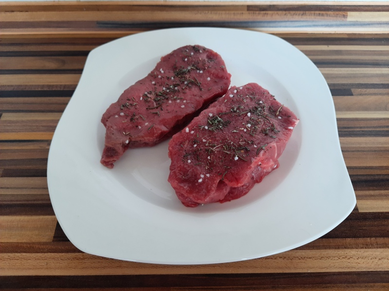 Připravit si výborný hovězí steak závisí hlavně na výběru masa. Mnohdy sehnat vhodné maso na steaky není legrace. U nás vymizely staré dobré masny a když nechceme za masem cestovat, musíme se spokojit s masem ze supermarketů. To není vždycky to pravé. Plátky masa bývají tenké a o mase se toho mnohdy moc nedozvíte. Já vím, že moje maso pochází z pastvin ve Skotsku, kde byl skot poražen i bourán a v Německu zabalen. Jestli jde o mladého býčka či starou krávu, jsem se již na balíčku nedočetla.