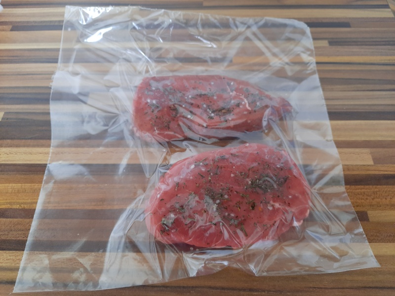 Masa jsem vložila do igelitového pytlíku, vysála vzduch a zatavila. Takto připravené plátky jsem hodila do sous vidu do vody ohřáté na 60 °C na 1,5 hodiny.