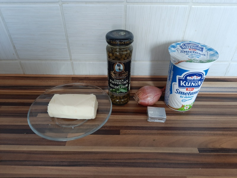 V rendlíku rozpustíme máslo a na něm necháme zesklovatět najemno nakrájenou šalotku. Pak přidáme pepřové kuličky, osmahneme je a zalijeme vařící vodu. Ještě do rendlíku rozdrobíme bujón.