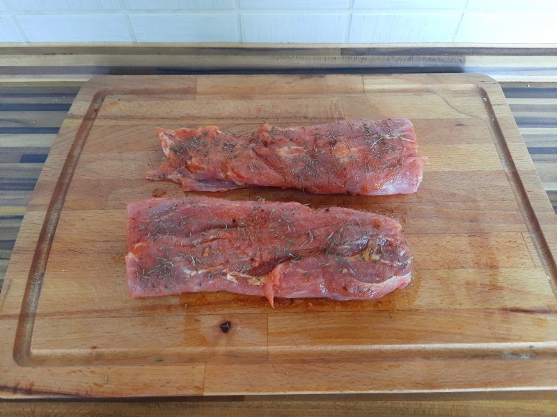 Panenku odblaníme, rozpůlíme a natřeme ze všech stran marinádou z oleje, soli, uzené papriky a granulovaného česneku. Namarinované maso posypeme tymiánem.