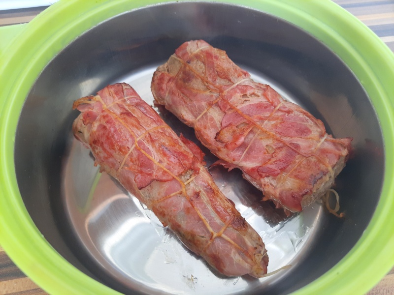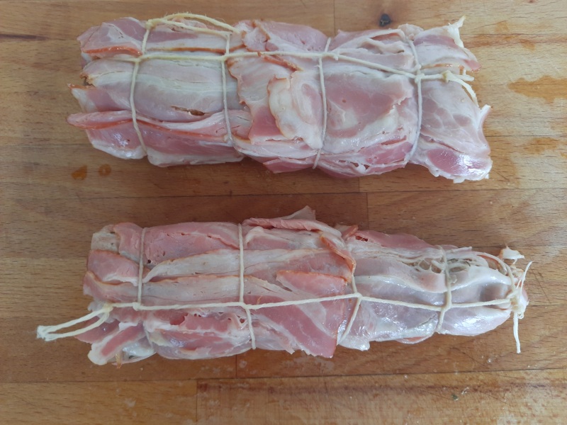 Uvařenou panenku jsem zabalila do slaniny a ovázala potravinářským provázkem.