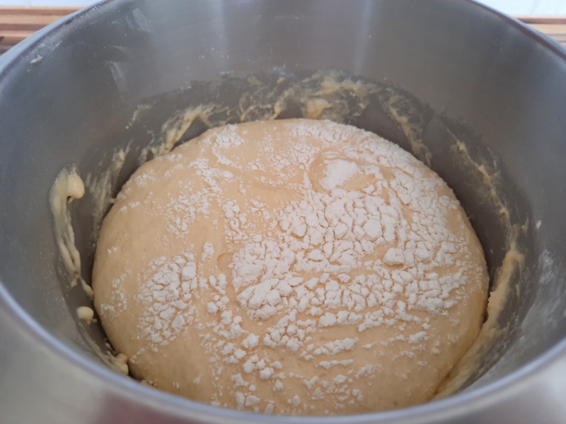 Uhnětené těsto zasypeme hladkou moukou, přikryjeme fólií a necháme kynout asi 1/2 hodiny na teplém místě.