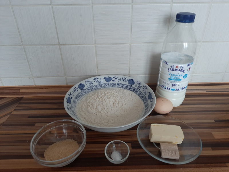 • 300 g hladké výběrové mouky + trocha na zasypání těsta a podsypání těsta na vále