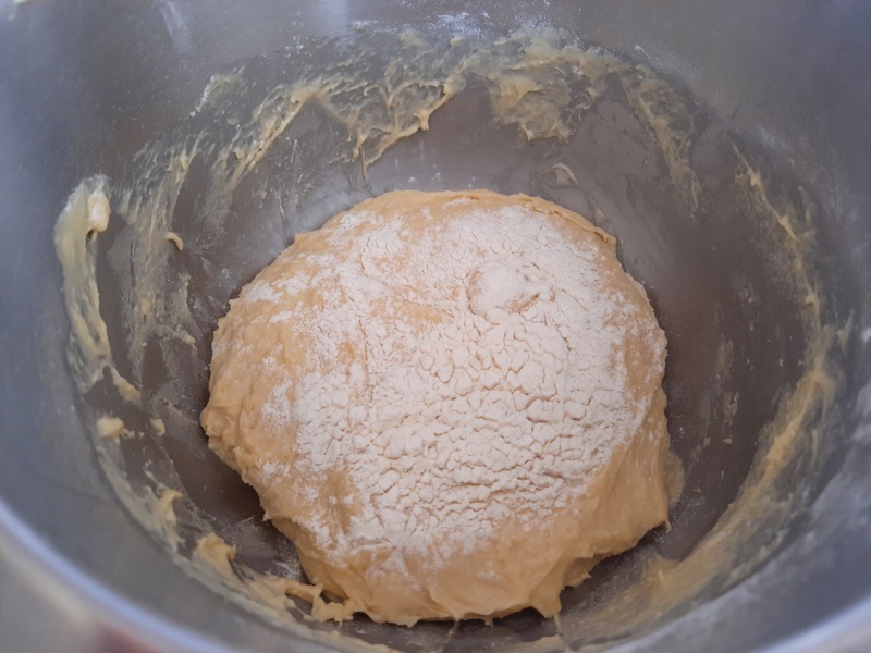 Těsto jsem hnětla v robotu hákem. Do mísy nasypeme mouku, přidáme zbytek cukru, sůl a promícháme. Pak přidáme mléko s Herou, celé vejce a hněteme. Zbytek mléka přidáváme postupně. Těsto nesmí být řídké, ale ani moc tuhé. Mouky různě sají, tak se úplně přesně nedá říct, kolik mléka. Já jsem ho spotřebovala celkem 200 ml. Těsto hněteme dokud se v těstu nedělají bubliny.