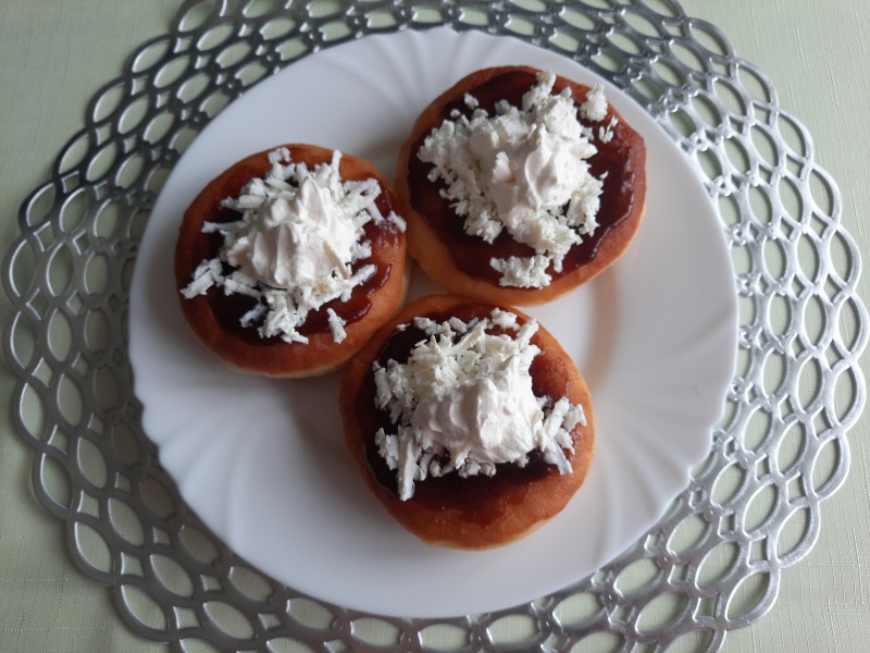 Hotové vdolečky necháme vychladnout a pak je mažeme marmeládou, sypeme nastrouhaným tvrdým tvarohem a navrch přidáme lžičku zakysané smetany.