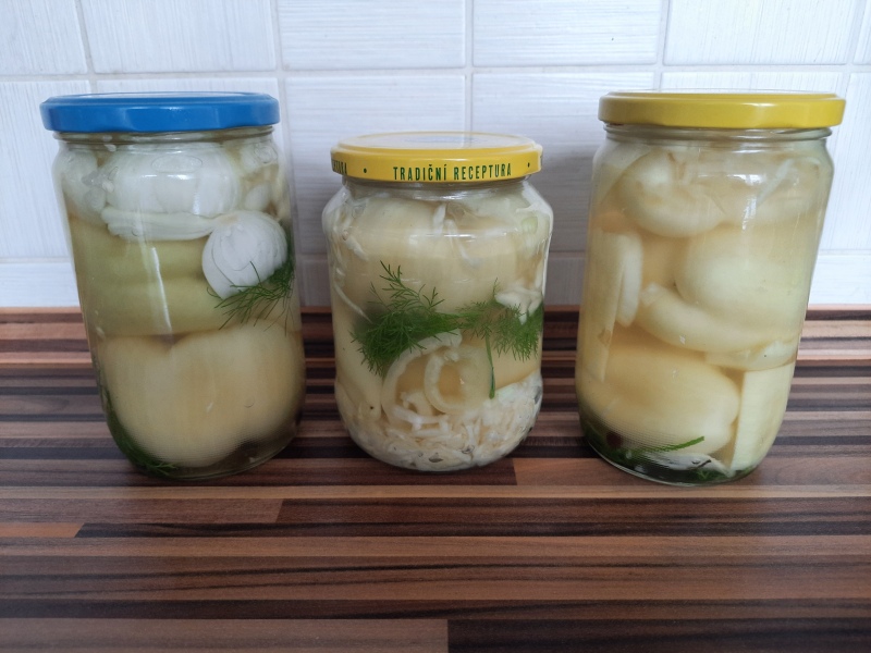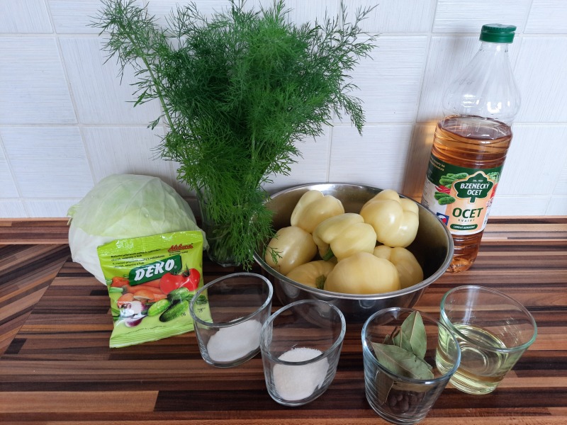 Chtělo by to baňaté sklenice. Ty jsem však neměla, tak jsem mezery mezi paprikami vyplnila zelím, dalšími nakrájenými paprikami a cibulí. Do každé sklenice jsem přidala 1 bobkový list, 1 kuličku nového koření a větvičky kopru.