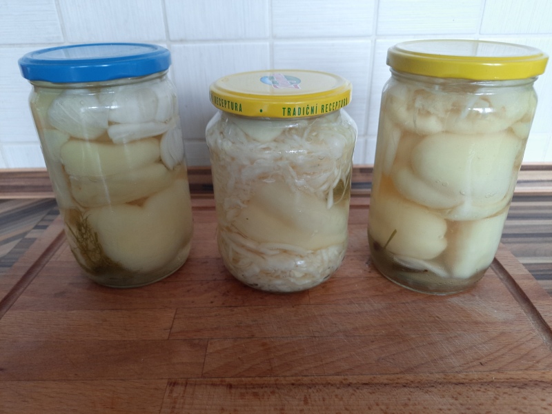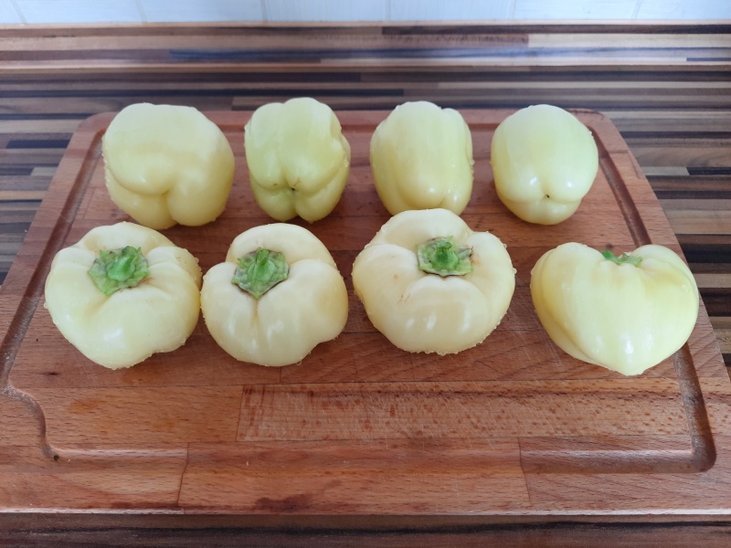 Baňatý tvar paprik mě přivedl na myšlenku naplnit je zelím a zavařit. Vím, že se takhle zavařují rajčatové papriky.