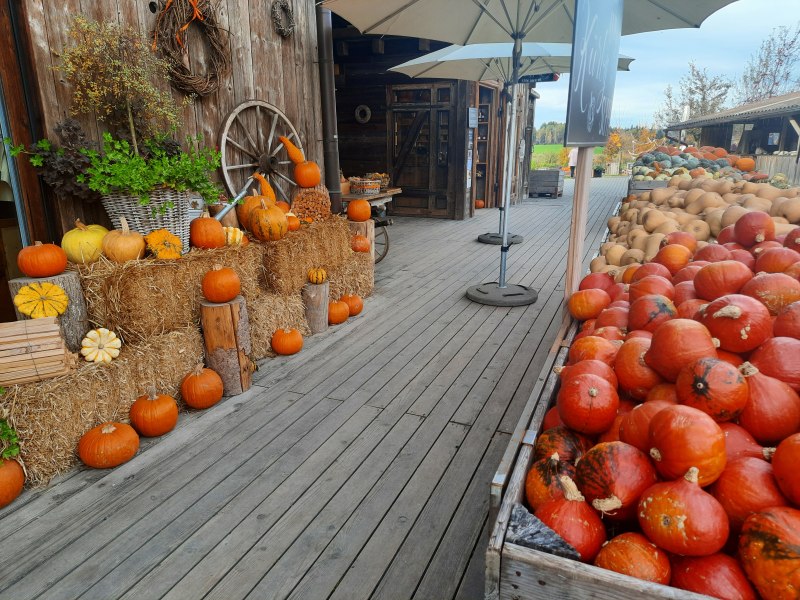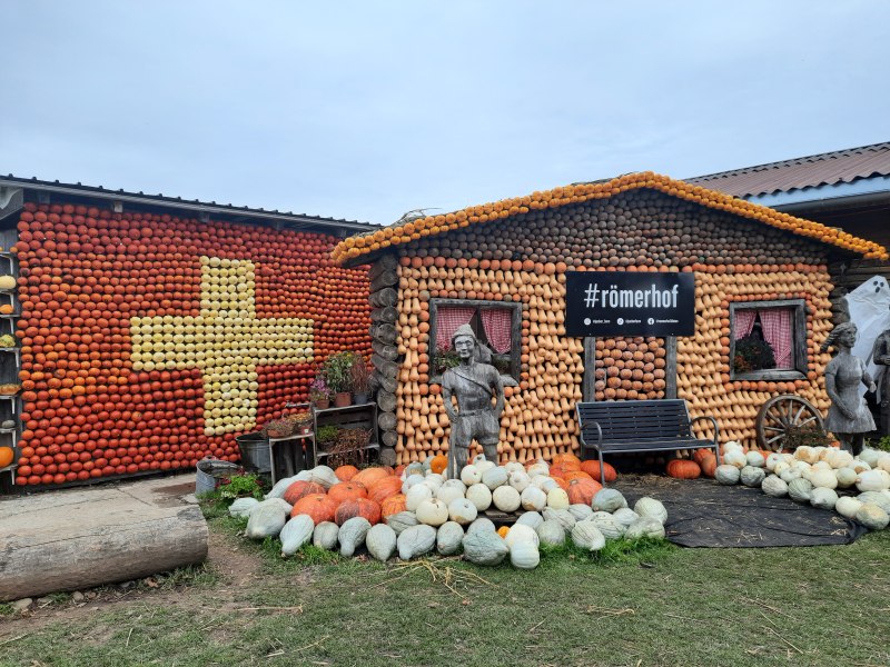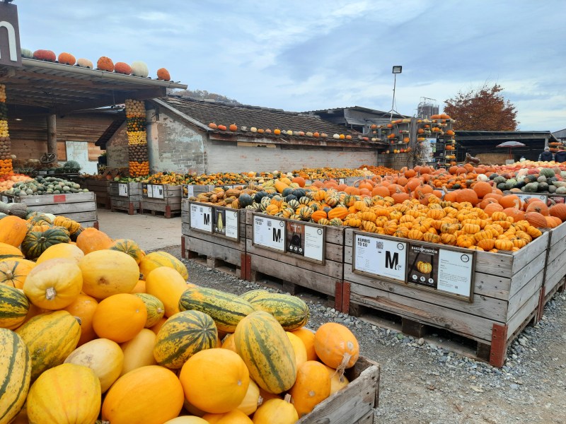 Nicméně, druhý den jsme se vydali na další Jucker farmu v Römerhofu. Tady nás už ze silnice upozorňovaly poutače na prodej dýní.