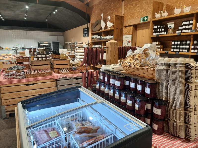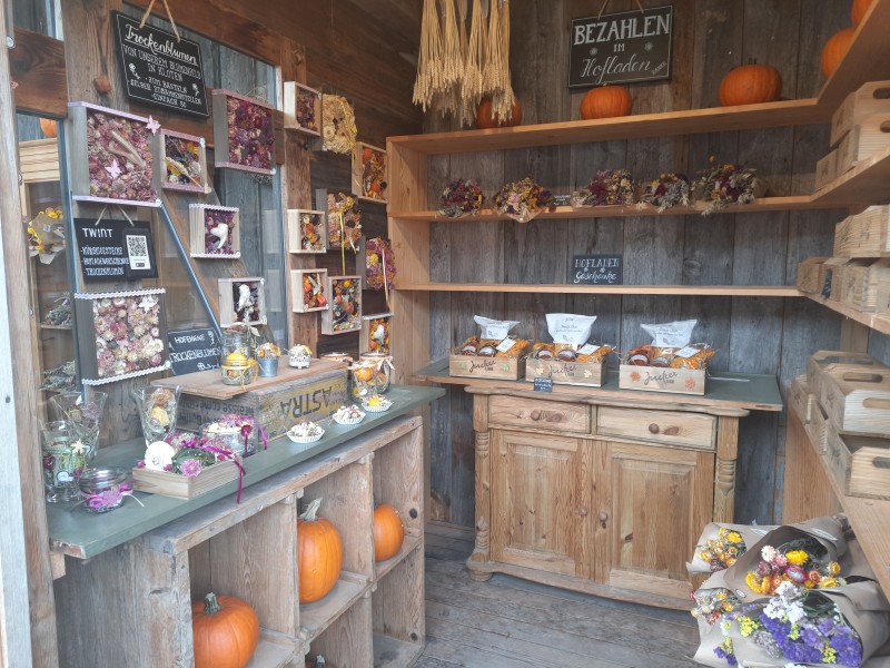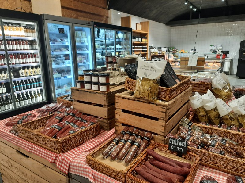 Po prohlídce farmy jsem navštívili „HOFLADEN“, tedy krámek s farmářskými produkty. Sortiment byl rozmanitý. Od ovoce a zeleniny až po nejrůznější masné výrobky. Já jsem si zakoupila čekankový puk, Krušnohorec sušené hovězí maso.