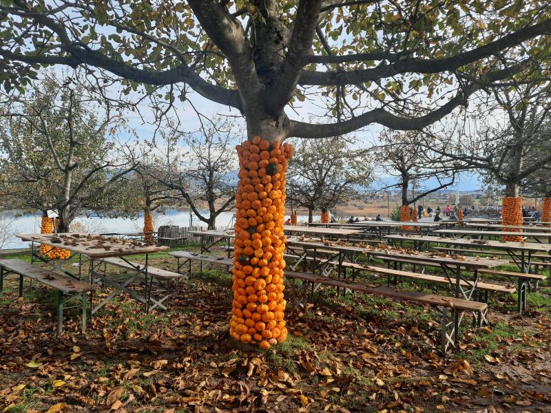 Stromy zde byly oblečeny do dýní. Podobně u nás ve Františkových Lázních oblékají stromy do háčkovaných kabátků.