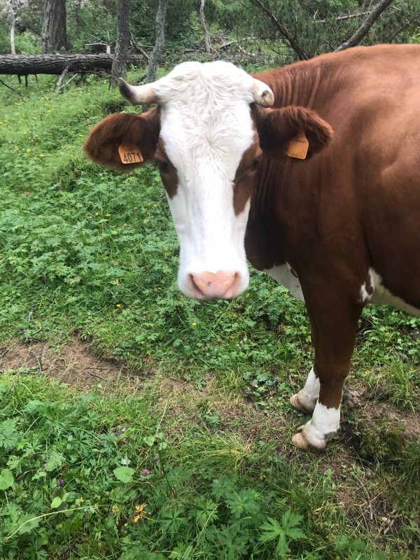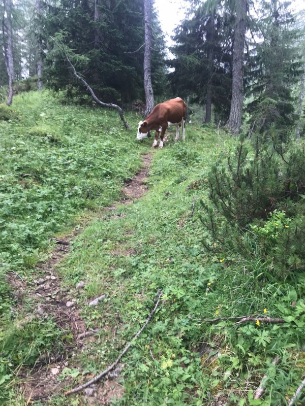Občas nebyla stezka ve vysoké trávě ani vidět. Přeskakovali jsme bažiny, potoky, klouzali po kamenech,… zkrátka kozí stezka. Místo koz jsme ale narazili na krávy. Ty jsme museli obcházet. Vůbec je nezajímalo, že stojí na naší stezce a překážejí nám.