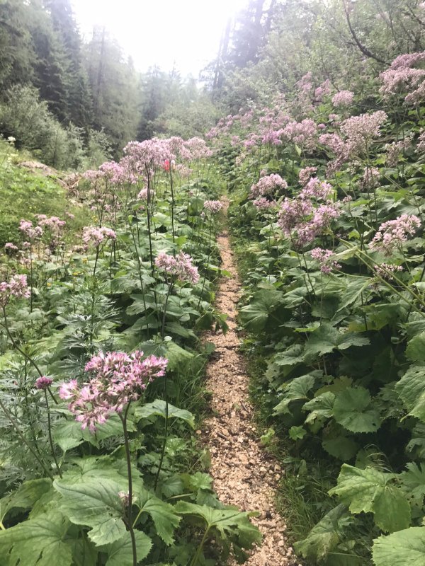 Naplánovali jsme si kratší pěší okruh. Část měla být po této široké cestě, ze které jsme později měli odbočit a vracet se po kozí stezce. Cestou nás provázely krásné výhledy na Alpy.