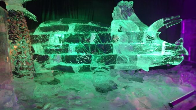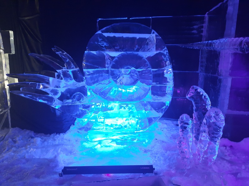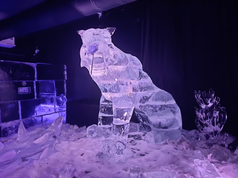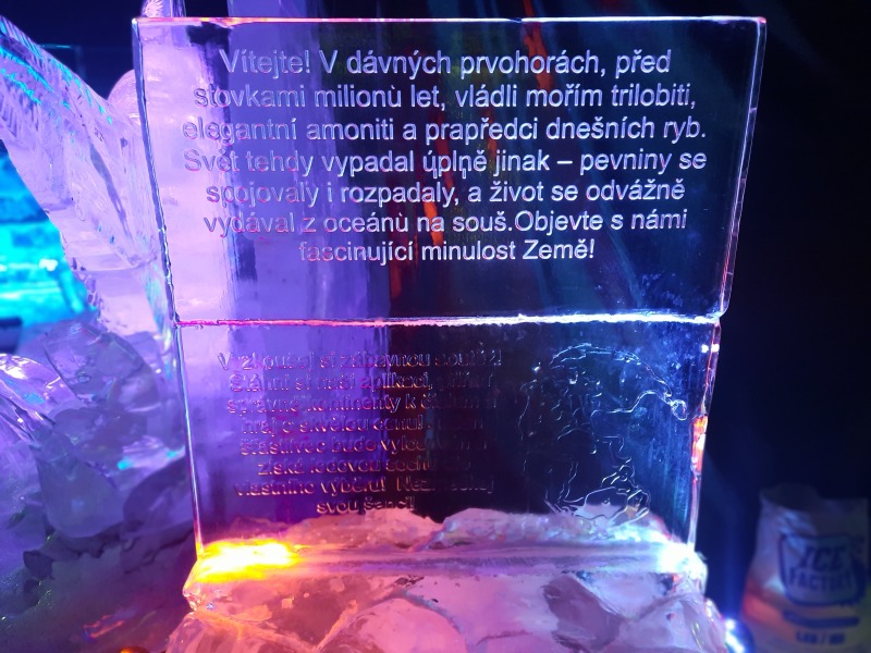 Výstava ledových soch se konala od 1. března do 11. května 2025. Do prostor Depa Moto Art byl vestaven kontejner, ve kterém byly vystavovány ledové sochy při teplotě -6 °C. Bylo třeba se tedy obléci. Je pravda, že se mi při venkovní teplotě kolem 20 °C zrovna do zimní bundy nechtělo. A nebyla jsem asi sama. Na výstavě kromě nás nikdo nebyl. Zaplatili jsme vstupné a vešli do temného mrazáku. Já jsem tam přímo skočila. Ve tmě jsem zakopla hned o první rohož a jen tak tak jsem skok vybalancovala.