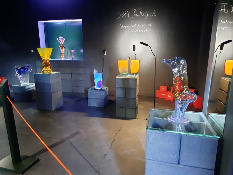 Odsud se prošlo do další temné místnosti s výstavou skla od Jiřího Šuhájka.