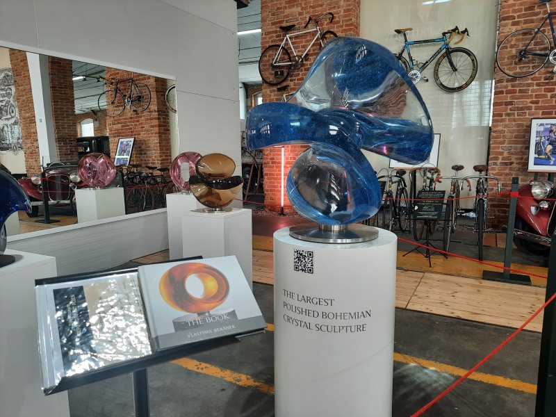 Chodbou plnou obrazů se od motorek prošlo do místnosti s dalšími skleněnými výtvory od Jaroslava Proška.