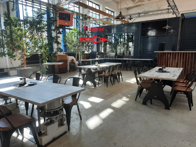 V přízemí, v pravé části areálu jsme uviděli místní pivovar. Před ním stoly pro konzumenty piva.