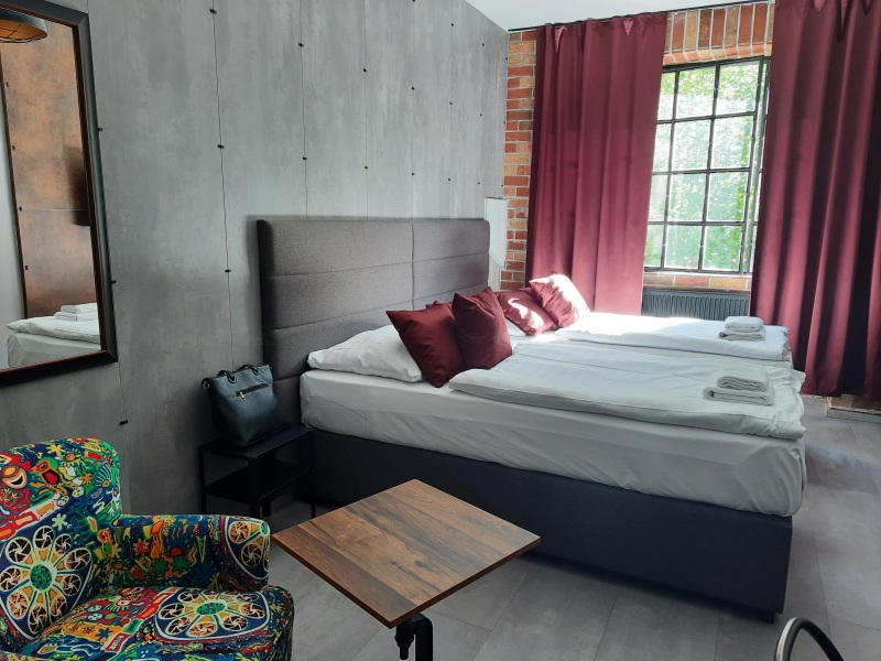 Na recepci jsme si vyzvedli klíče od pokoje v protější budově, která byla přestavěna z bývalé továrny na balící stroje. Vešli jsme do industriální budovy.