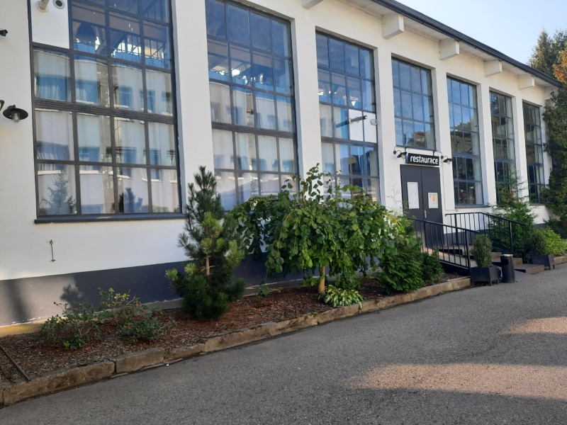 Prošli jsme uličkou mezi pivovarem a restaurací do chodby, kde po levé straně byly místnosti pro různá školení, firemní akce, sleziny,… Vpravo okny byla vidět pěkná zahrádka pro venkovní posezení.