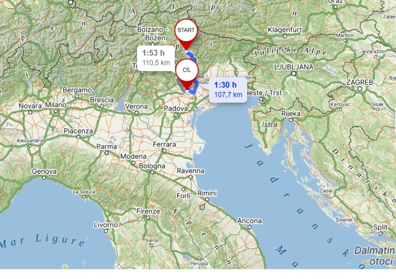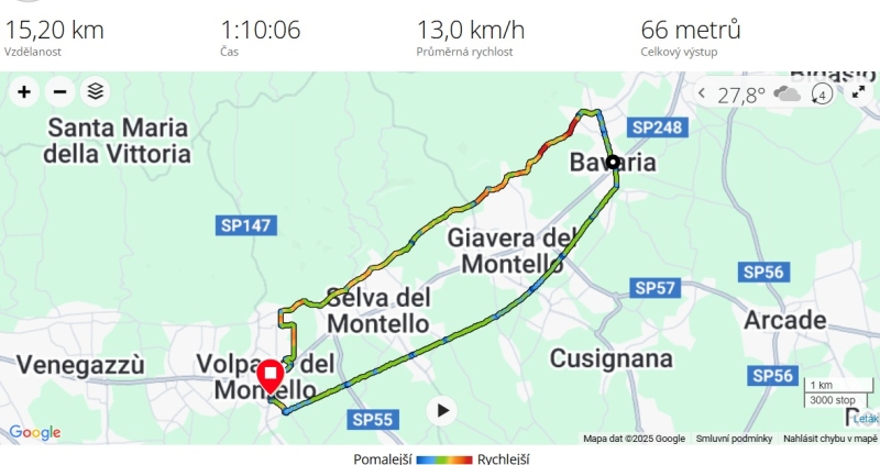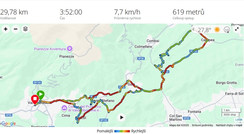 Druzí rodiče vyjeli do Voldobbiadene na kolech napřed. Syn s přítelkyní jejich autem a my naším později. Zpáteční cestu jsme měli všichni jet autem. Takže rodiče synovy přítelkyně byli pěkně znevýhodněni. Vlastní pohon a ještě asi o 20 km našlapali více.